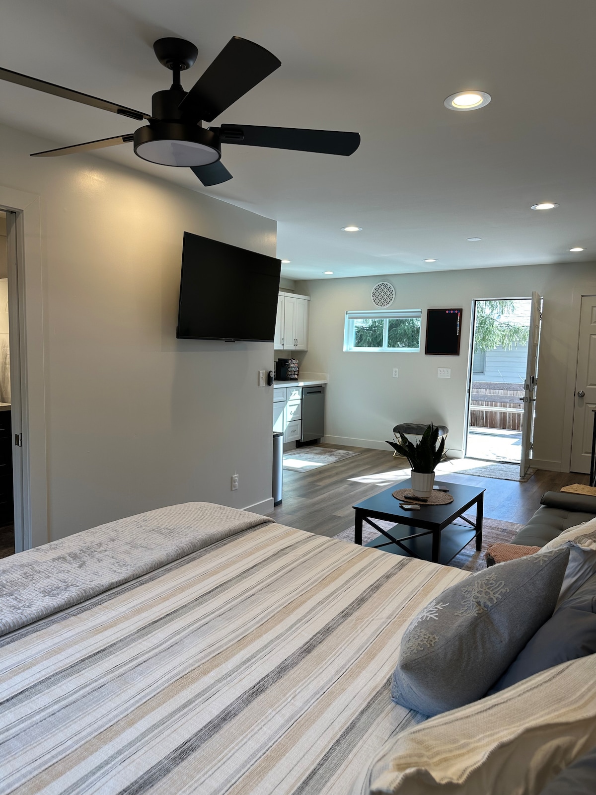 Studio Apt. Modern. Thoughtful Design. Super-comfortable & clean. European comforts, beds & bedding, & latest technology in a quiet neighborhood. 50"TV with Streaming, Super fast Internet & Ethernet. Kitchenette with microwave, toaster & a Keurig. Bathroom with Rain & Hand-held showers, Bidet. Fun lighting installation in shower. In a good, quiet tree-lined neighborhood, walk 2 blocks to Downtown. A great home-base for Grand Canyon & Sedona day tripping!