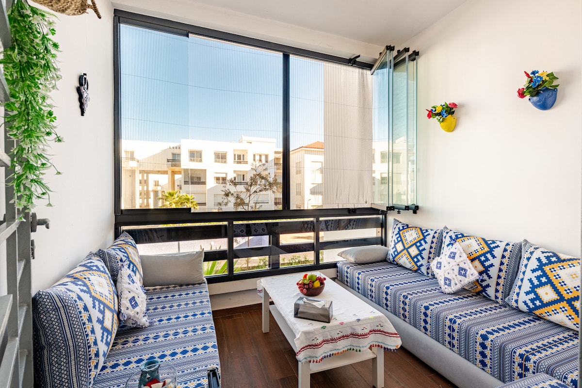 Profitez d'un nouveau logement décoré et vivant de la ville de Mohammedia. Entièrement équipé et d'une superbe vue sur la mer depuis la terrasse en orientation SUD. L'appartement est dans une résidence sécurisée (24/24 H) au cœur du parc de Mohammedia. - 5 mn à pied de la plage - 2 KM de la gare - 25 km de la mosquée Hassan II Cet établissement met à votre disposition un ascenseur, un service de sécurité et nous présentons une facilité de check-in et check-out grâce à notre serrure connectée.