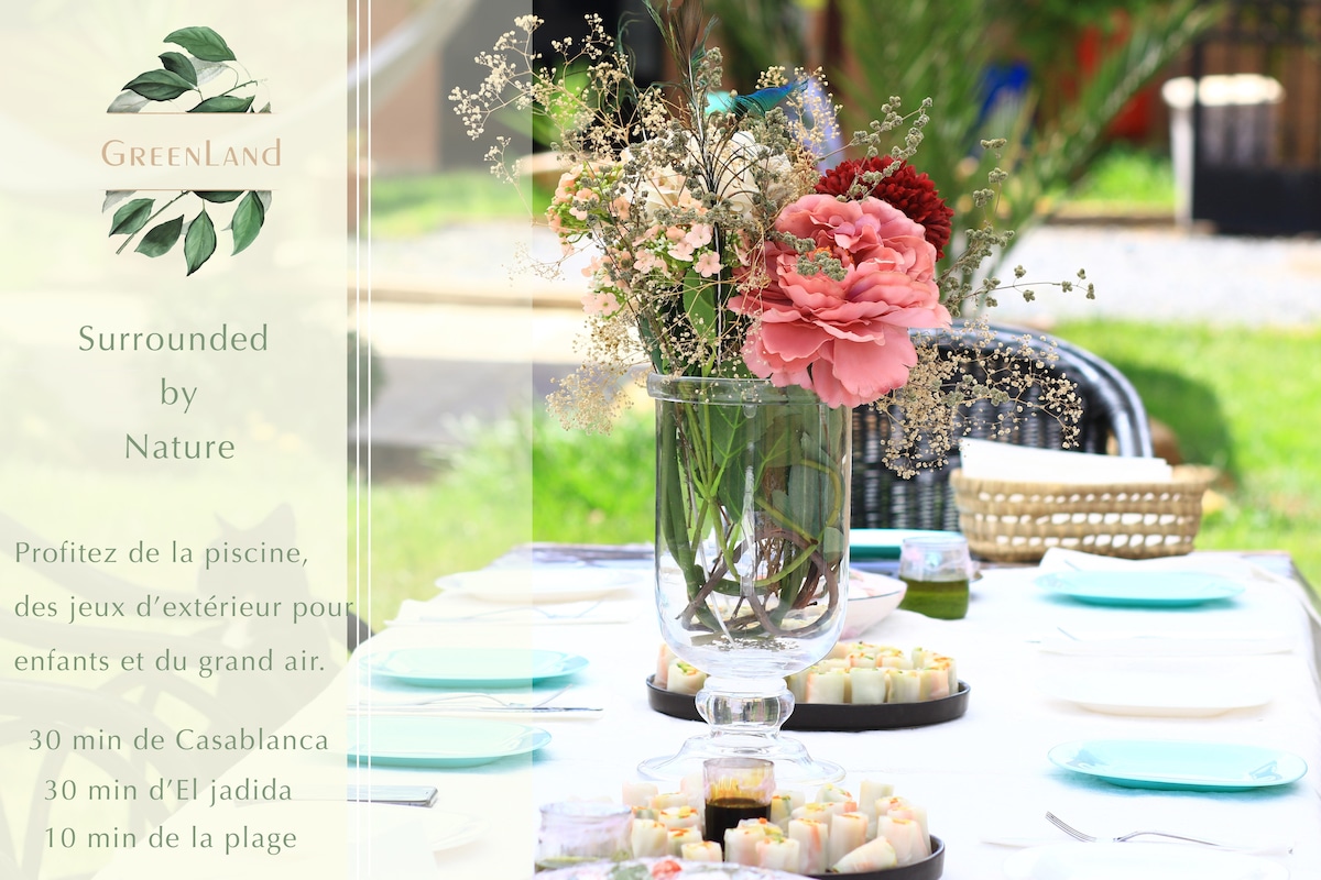 Villa tout confort en pleine campagne de 15 000 m2 construite sur 450 m2, piscine et vue sur mer à 45 km de Casablanca. La villa dispose d'un double salon, salle à manger, 3 chambres, 2 sdb, une cuisine tout équipée. La terrasse dispose d'un salon, 1 grand bed, 1 table à manger, 1 barbecue, hamacs, potager, pingpong, jeux de pétanque et billard, une cabane pour enfants. Des équipements bébé (baignoire, lit parapluie, chaise haute) disponibles sur demande. Lieu paisible à 2 km de la mer.