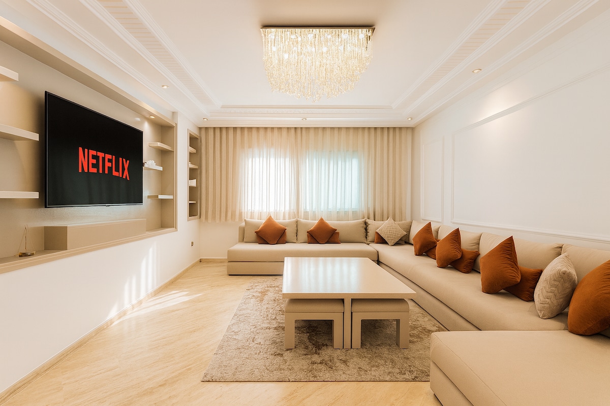 Perla 403 💎 , un havre de paix où l'élégance d'une résidence moderne s'allie au confort des hôtels 5* en plein cœur de Casablanca ! Relaxez-vous dans un salon spacieux au design moderne, équipé d'une Smart TV 55’ avec Netflix et IPTV pour des soirées de détente absolue. La chambre, véritable nid douillet, vous promet des nuits paisibles et réparatrices ☁️ Depuis votre balcon privé, admirez les splendides couchers de soleil sur la ville, rendant chaque moment de votre séjour inoubliable ! ✨