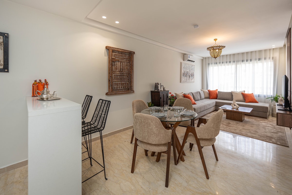✨ Elegant retreat in the heart of Casablanca, right across from Casa Port train station. This bright and spacious 83m² apartment offers all the comfort you need for a perfect stay and can comfortably accommodate up to 5 guests. It features 2 peaceful bedrooms with garden views, a home cinema-style living room (75" TV), a balcony overlooking the Hassan II Mosque, a fully equipped kitchen, and a dedicated workspace. Perfect for relaxing moments, whether for a weekend or an extended stay 🌇🌿