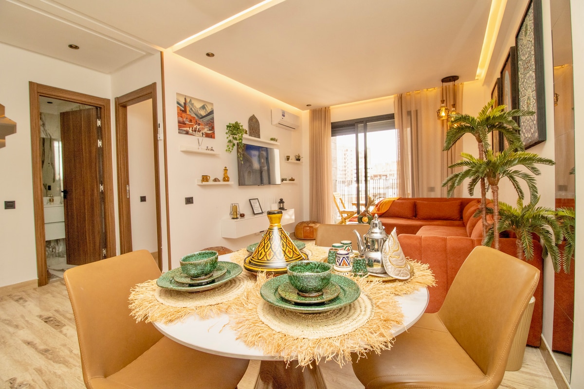 Profitez d'un nouveau logement décoré et vivant de la ville de Mohammedia. Entièrement équipé et d'une superbe vue sur la mer depuis la terrasse en orientation SUD. L'appartement est dans une résidence sécurisée (24/24 H) au cœur du parc de Mohammedia. - 5 mn à pied de la plage - 2 KM de la gare - 25 km de la mosquée Hassan II Cet établissement met à votre disposition un ascenseur, un service de sécurité et nous présentons une facilité de check-in et check-out grâce à notre serrure connectée.