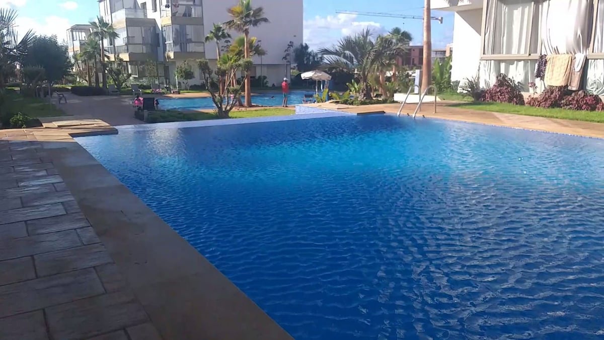 Ce logement paisible offre un séjour détente pour la famille 👪 appartement vue sur piscine avec un parc de jeu pour les enfants l'appartement dans une résidence fermée sécurisée à puerto banus el mansouria à proximité de la plage 5 min à pieds Wi-Fi et Netflix accessible aussi