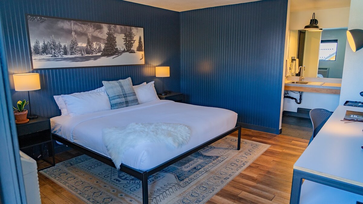 The Inn is conveniently located between Granby and Winter Park. The amenities are abundant: Pool table and game room, hot tubs, year round pool, Racquetball/Pickleball rooms, Fitness Room and Sauna. This hotel-style room is no-frills with a comfortable King Sized bed, microwave, mini fridge, coffee maker, and full bathroom. There is a small patio/balcony off the room. If you just need a room, why spend more?