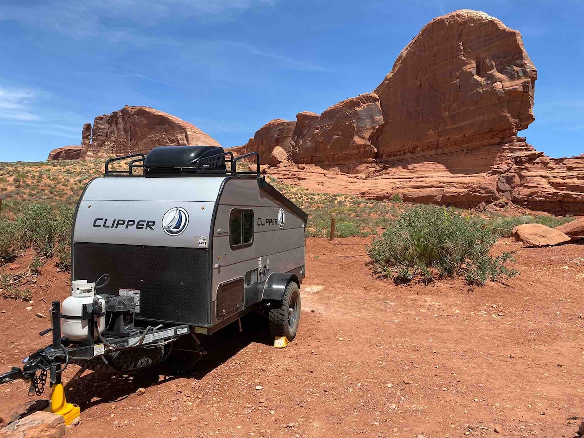 Nothing beats the feeling of spending the night in the great outdoors and there is no better way to experience Moab's amazing red rock desert. This top of the line trailer will make your camping experience a glamping experience! Greet the beauty of the desert while cooking breakfast in our well equipped outdoor kitchen. We deliver to your campsite. No need to tow! You secure your campsite and we take care of the rest.