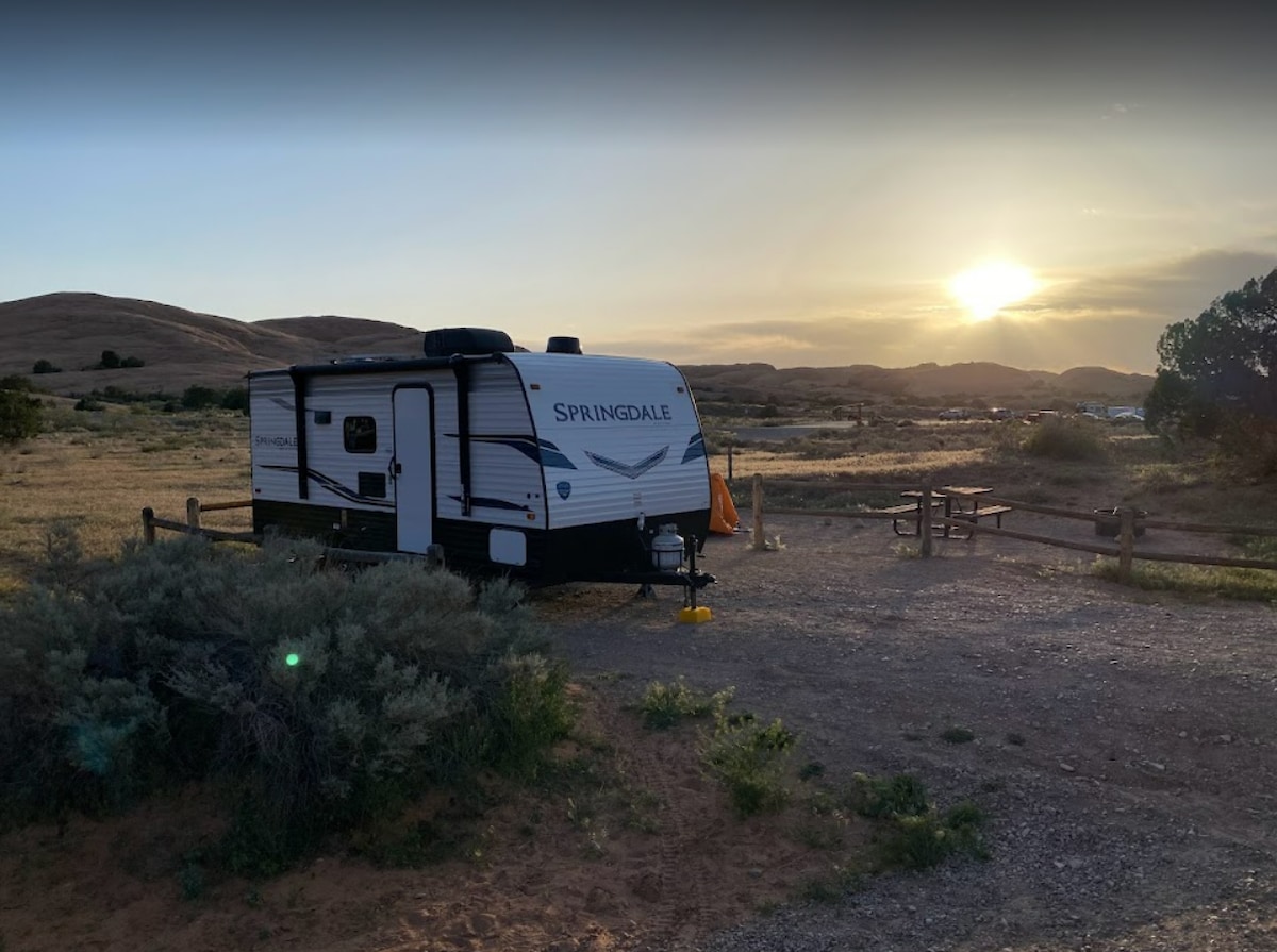 Escape to nature without giving up comfort! This spacious RV offers the perfect blend of outdoor adventure and indoor comfort. Nestled in the scenic Moab RV Resort, it is ideal for families and pet lovers. You'll enjoy quiet nights by the fire pit, stunning mountain views, and close proximity to national parks. Your stay includes all the essentials for a hassle-free experience—just arrive, relax, and explore. Adventure awaits. Book now and enjoy unforgettable glamping in Moab!