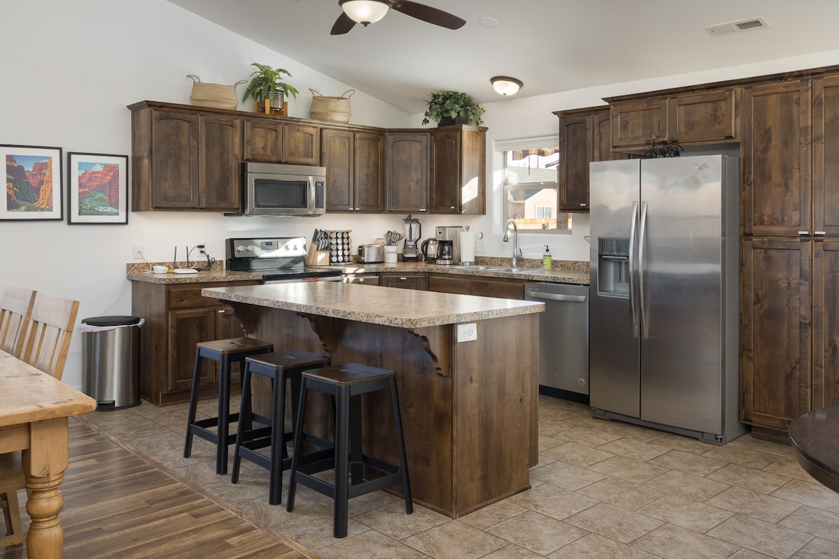 Escape to our newly remodeled Red Rock Oasis in Moab! This private townhome offers stunning 360-degree cliff & mountain views. Perfect for 2 couples or a family, it features modern design, a full kitchen, and access to a community pool & hot tub. Enjoy serene privacy just a 5-minute drive from downtown Moab's shops and restaurants. Secure garage parking included.