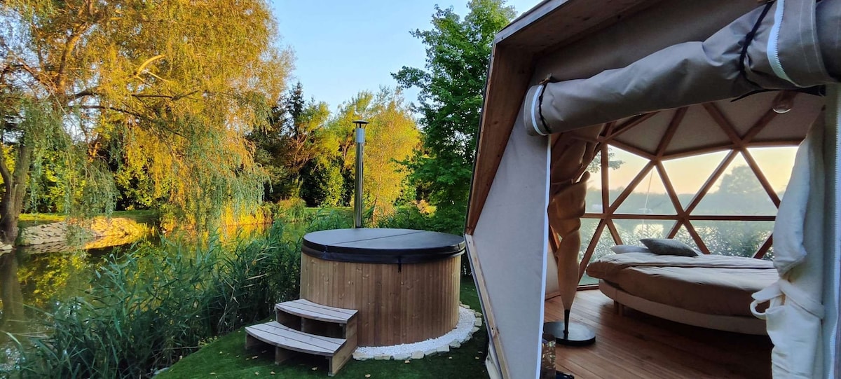 Situé sur une petite île au milieu d'un étang et au coeur de la nature, venez découvrir ce dôme tout confort ainsi que son bain finlandais privatisé. Vous avez également la possibilité de réserver dans nos deux autres logements visible sur notre profil (Ces deux logements sont situés autour du même étang sans vis-à-vis) airbnb.com/h/serre-ledomainedespins57 airbnb.com/h/chalet-ledomainedespins57