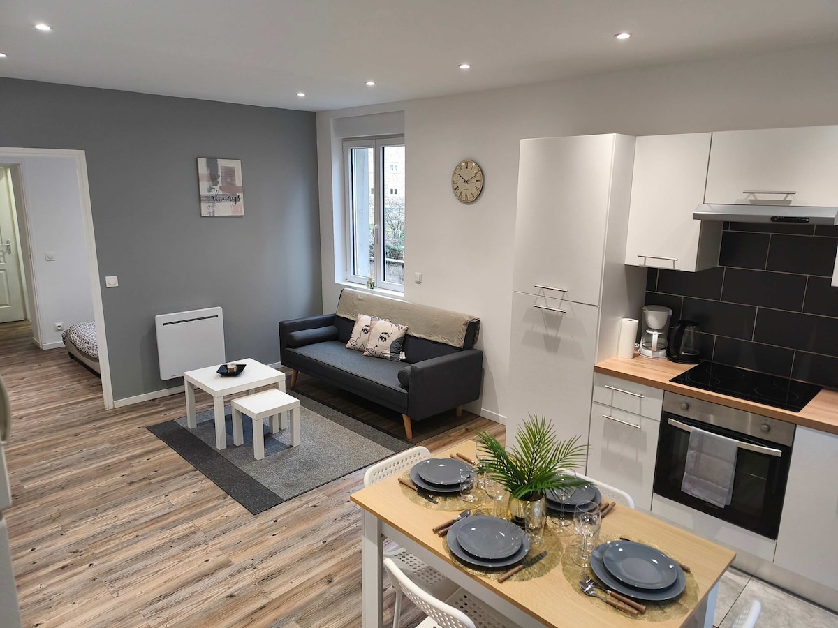 C’est dans cette jolie rue calme bordée de tilleuls et en rez-de-jardin de notre maison que nous vous proposons un gîte tout neuf de 40 m2 fait avec amour dans un style contemporain. L’entrée du gîte, qui est indépendante se trouve à l’arrière de la maison. Nous sommes à 8 minutes à pied de la cathédrale, donc du centre et proches de nombreuses villes touristiques telles que : - Gérardmer et ses pistes de ski à 30 mn . - Colmar et la route des vins à 50 mn. - Nancy à 60 mn. - Strasbourg à 80 mn.
