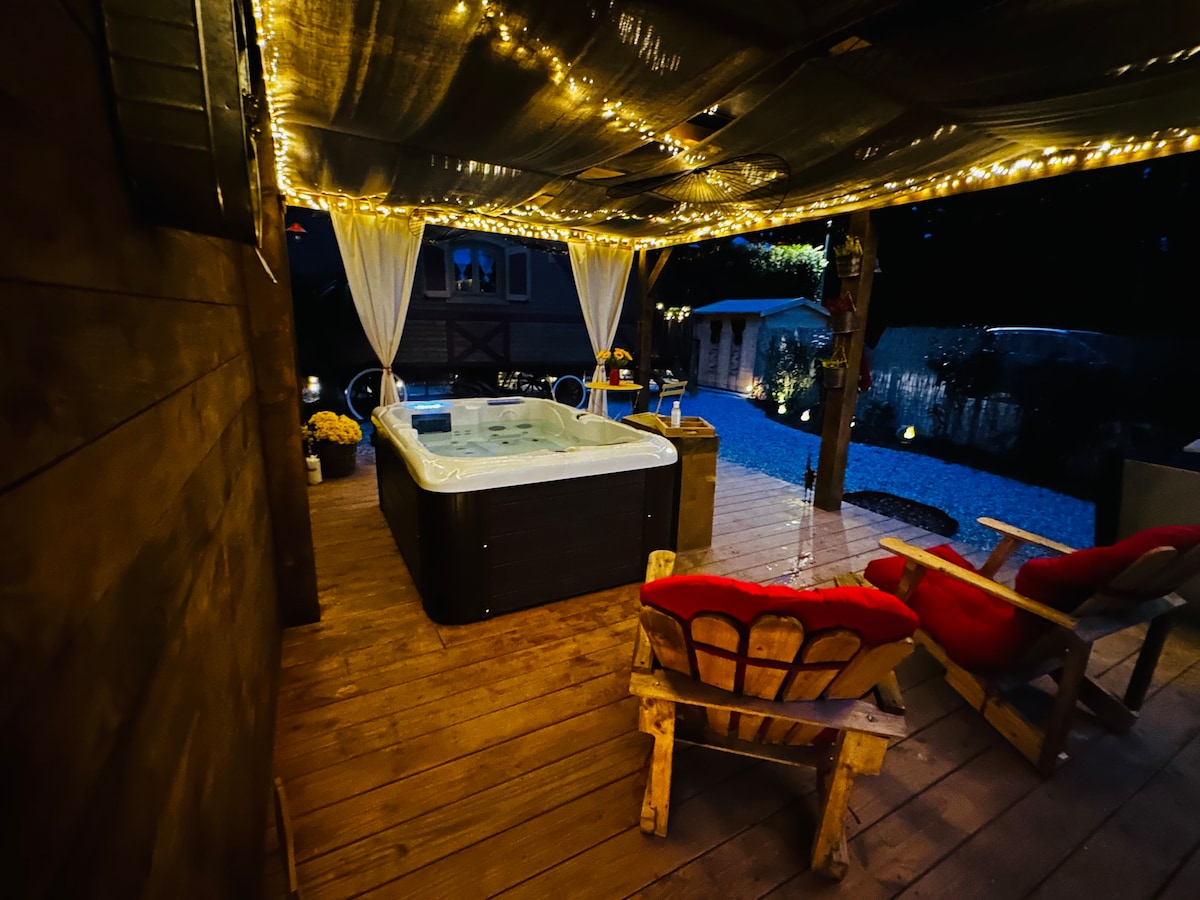 Plongez dans l'univers d'un refuge de berger alpin en couple. Votre refuge entièrement en bois est composé d'une salle d'eau avec douche, lavabo, wc, d'un espace nuit avec un lit 140X200. Votre accès directement à votre terrasse avec vue sur la nature et votre jacuzzi privé vons feront passé de bons moments en amoureux et "on ne sait jamais sur un malentendu..." Les linges de toilettes sont fournis et le lit sera fait à votre arrivée.
