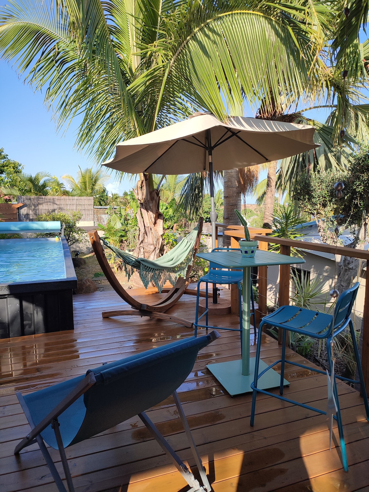 Imaginez vous, sur la véranda, sirotant un petit verre de punch glacé, allongé sur les 'sunbed' avec rien entre vous et la mer, enfin si un jardin de cocotiers. Hum..... le bruit des vagues, un bon livre, vous êtes vraiment en vacances. Envie de marcher, d'aller voir les baleines et les dauphins, la situation de la maison est très centrale dans l'ile pour rayonner partout. Une envie de brioche au géranium avec un thé à la vanille, à 3 mn à pied tout ce qu'il faut. vite, venez nous voir !