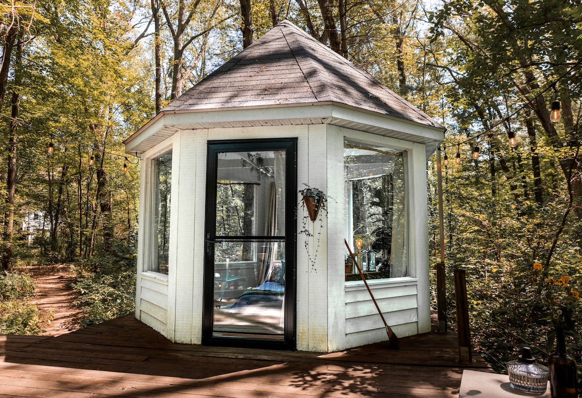 Steeped in nature, the gazebo provides a get away into nature, with its double bed and intimate sized room this is a wonderful space for 2 to be immersed in a peaceful environment. Whether you came here to rest & revive or to explore there is plenty to be had! The gazebo has a nearby compostable toliet (shared with other guests), and just a 1 minute walk on a path in the woods to the main house (where the full bathroom is that can be used 9am-8pm).