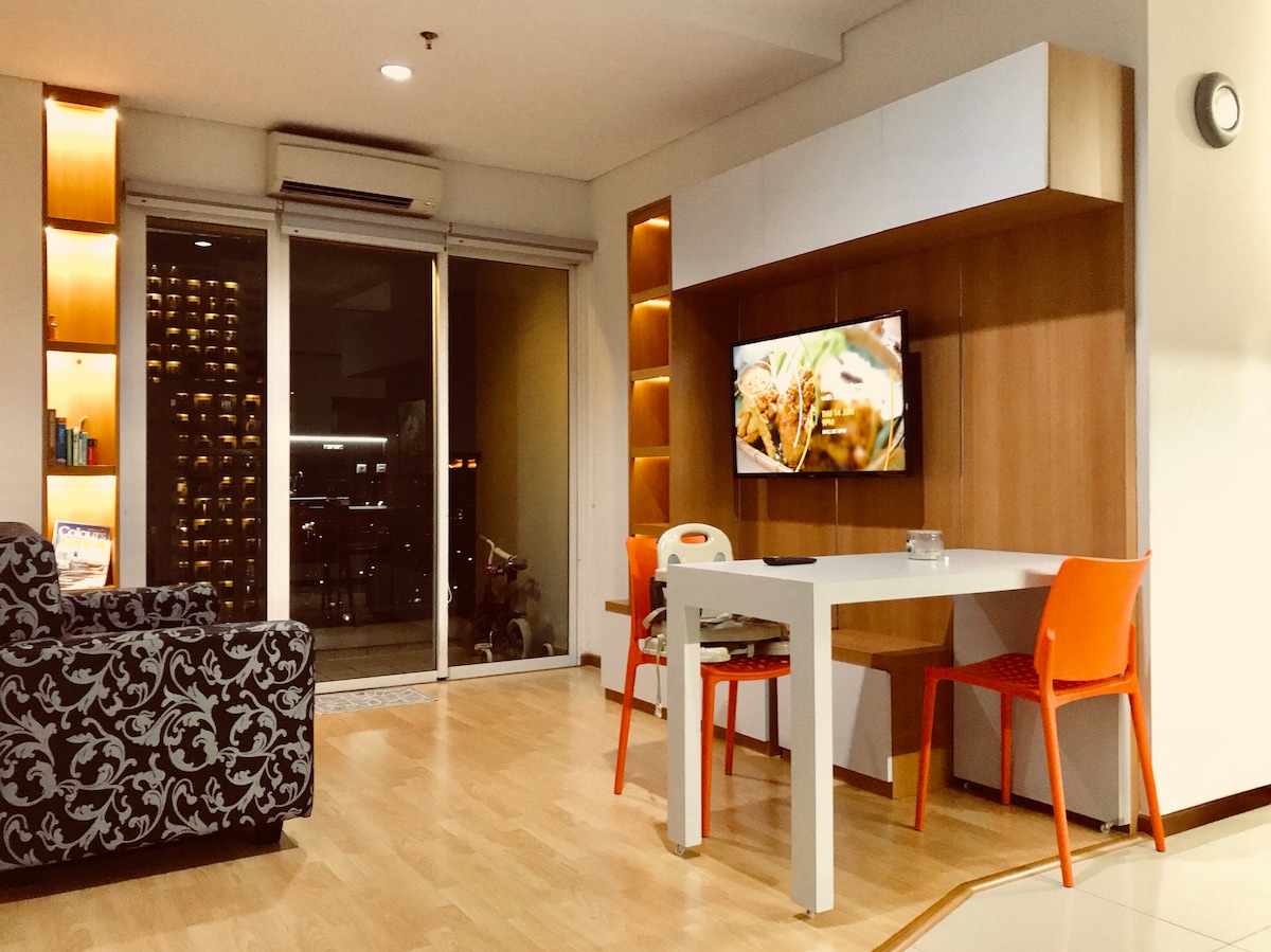 One bedroom apartment,100mbps WiFi speed. New bathroom with hot water, washing machine, kitchen with gas stoves, microwave,fridge,rice cooker,toaster, utensils &a sitting room that can be used as additional bedroom with android TV providing Netflix & Disney.The Apartment is within Thamrin City Shopping Complex. Please note that we are in a tropical country so some type of insects are common. I employ a professional regular pest control in my unit, but you may still see occasional cocroaches