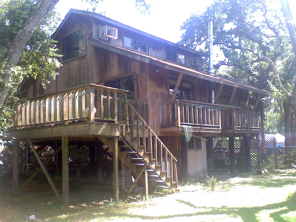 2-Story Wood sided House, on posts, stairs to entrance, fenced 2-lot yard. 2 BR, 1 on first floor, 1 on second floor, 1 &1/2 baths, loft for extra sleeping area. Large living/dining room/kitchen island area. Wood stove. Wi-fi available, complete kitchen, Gas Grill, charcoal grill. Tile floor and extensive knotty pine ceilings, some wood walls. Dead-end street, 2 blocks to beach, grocery and bar/restaurants. Back deck. Double lot, fenced, with many live oak, banana, palm trees, ginger.