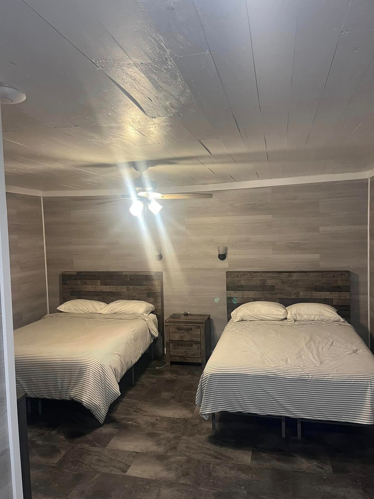 Cabin is one of six (6) cabins with 2 private bedrooms, sleeps 6 people comfortably (2 full/2 single beds) One bedroom has a full bed, one bedroom has a bunkbed (full on bottom, twin on top, living area has a twin bed.) Kitchens with basic pots/utensils- microwave, stove/oven, ice box. Each cabin has a cement patio & picnic table, full baths, central A.C./heat & DirecTv with sport channels. We provide linen, but no towels.