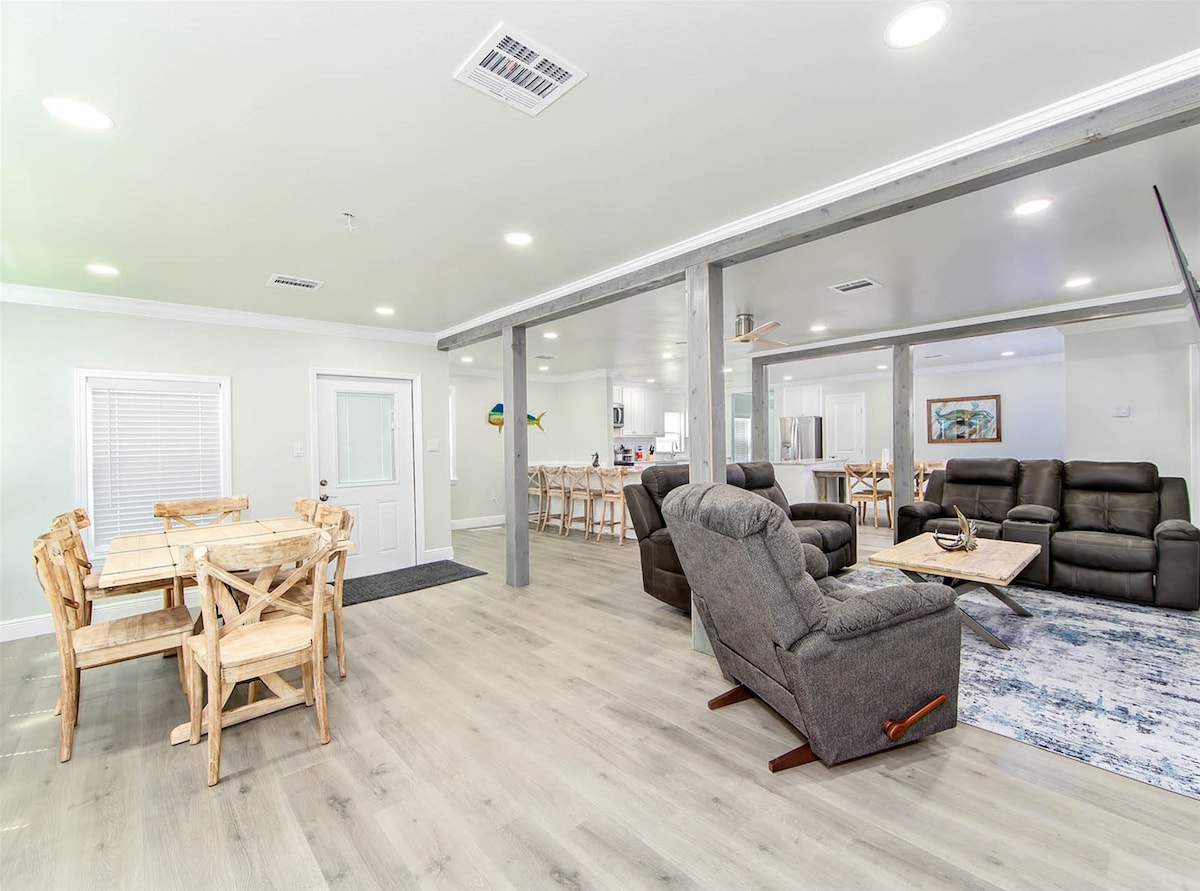 Watch the sunrise over Grand Isle Beach from your gulf front porch, then head down the private path for a day in the surf and sand. This fully remodeled 8-bedroom home gives big groups plenty of space to cook, hang out, and unwind—whether that’s upstairs in the open living areas or downstairs on the covered deck (made for seafood boils and family cookouts). Shops, bars, and restaurants are all within a short walk/drive, making this the perfect beachy getaway spot for the entire crew.