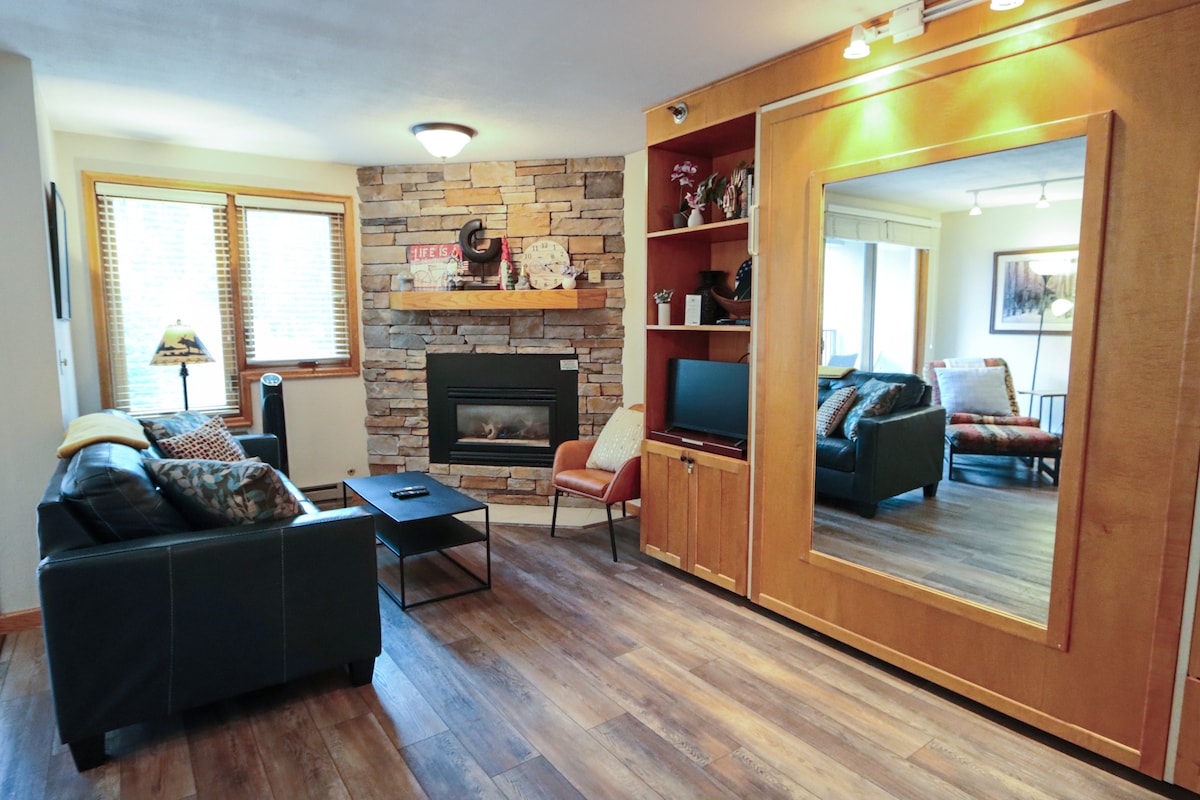 Contemporary vacation rental is located at the base of the winter park ski resort. Premier one bedroom with king bed. Sleeps 4. On third floor with access to bbq, BRAND NEW hot tub and fireplace. Enjoy an efficiency kitchen with stainless steel appliances. Self check in. License #005596