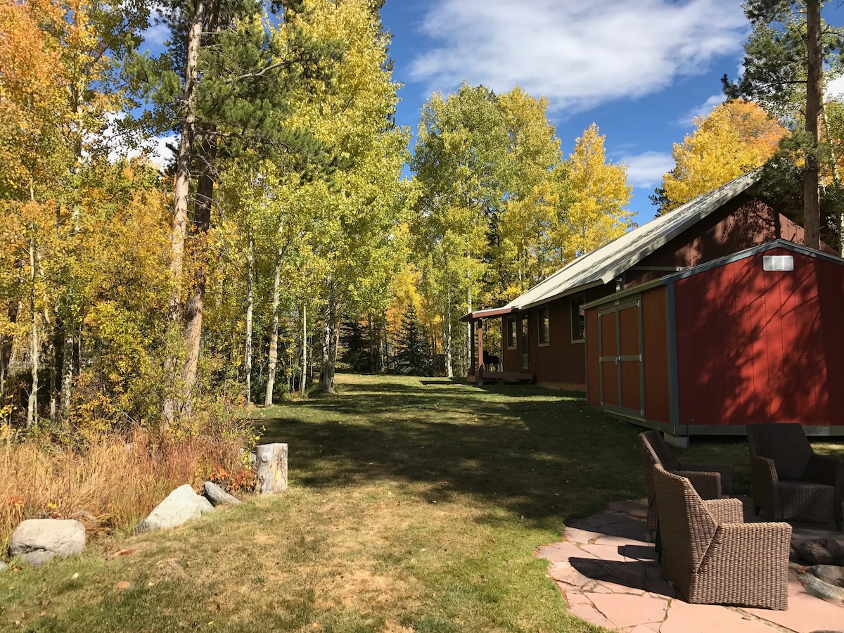 Our freshly redone, 3 bedrooms, 2 bathroom, cabin sits on 2/3 of an acre, across from Shadow Mountain, among Aspen, with 2 natural springs flowing, across from a Private Wetland where Moose, Elk, and Deer, can be found in our grassy yard. The cabin is located in a quiet mountain area with land to play games, sip coffee on the deck watching the sun rise, relax at the fire pit roasting s'mores watching the sun set, and listening to the Colorado River. We are close to HWY 34. $50 pet fee , max 2.