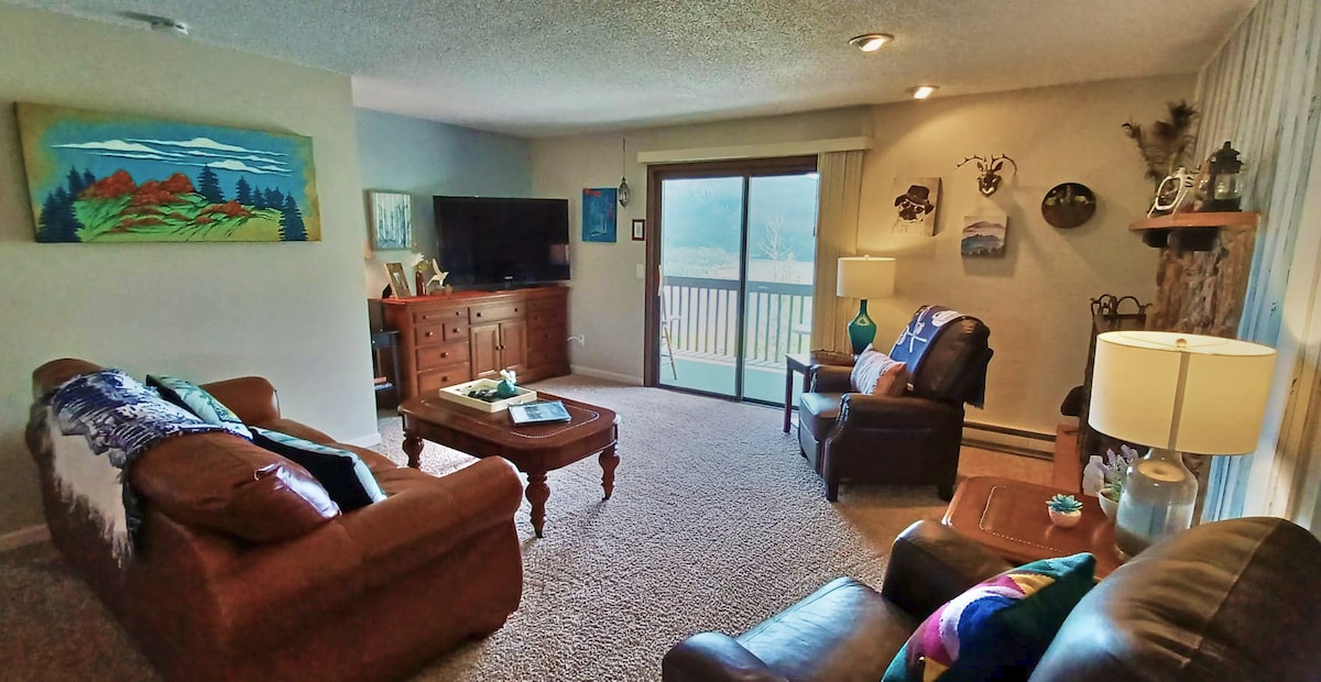 This relaxing, stylish, inviting condo is in the "soul of the Rockies." Bring comfort to a new level with a fully- stocked kitchen, spacious bedrooms, bathrooms with modern showers, and a drawer full of games. This newly built condo offers all the comforts of home with a downtown convenience. Year-round activities within a short walk-hike, swim, fish, miniature golf, snowmobile, snow shoe and XC ski. A short drive to downhill ski and golf are a few options to complete your experience.