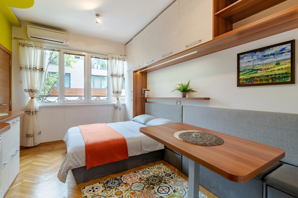 Charming and Stylish New-Built Studio in an Old Building – Varna Center. Step into sophistication with this sleek, newly built studio, perfectly nestled (3rd last floor) within an elegant old building in the heart of Varna. This prime location offers the ultimate urban experience—steps away from the picturesque Sea Garden, rich historical sites, sandy beaches, museums, the Roman Baths, the vibrant port, and an array of trendy bars and restaurants.