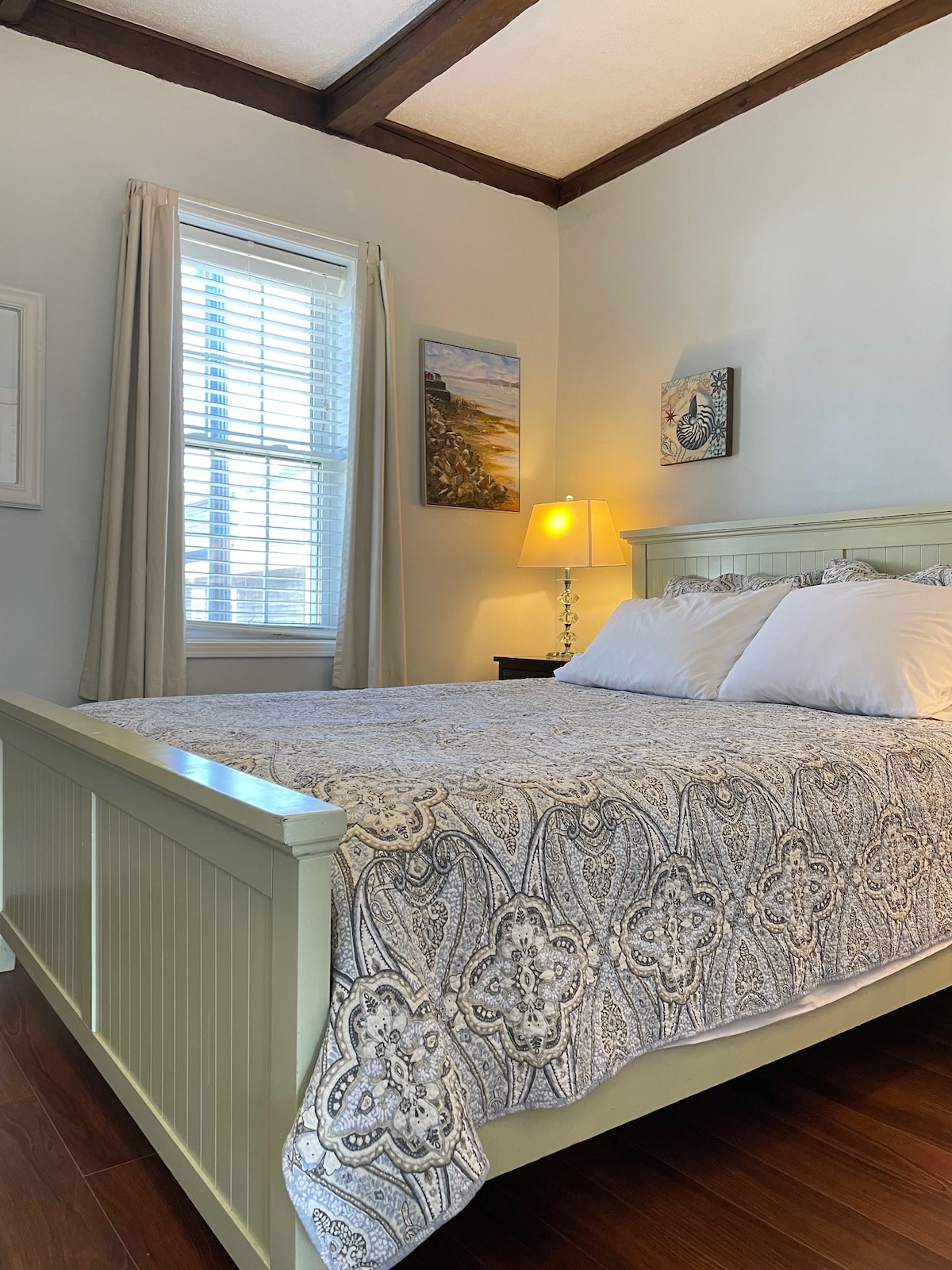 Modern studio apartment in a historic building in Eastport Maine. 460 sq ft with private deck, king-sized bed, sitting area w/gas stove, galley kitchen, and bathroom. Walk-out second story deck overlooks large side-yard and has table, umbrella, and chairs for outside dining or simply enjoying the day. Private entrance and off-street parking. Well-equipped kitchen w/ refrigerator/freezer, Keurig, kettle, toaster oven, cookware, knives, utensils, dinnerware. Large closet with vacuum and heater.