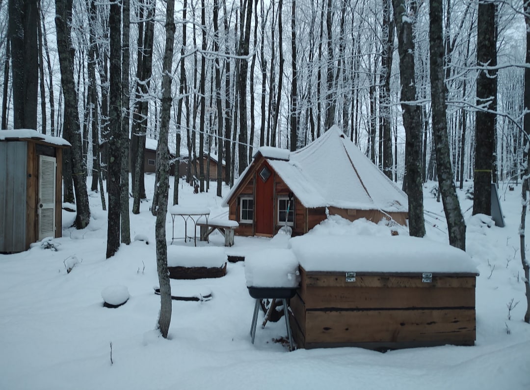 Rustic, solar bunkhouse - The Roost! Glamping at it's best. Get away from it all in this simple bunkhouse made with recycled materials and wood siding from trees milled on site. Large window, covered deck, outdoor seating and fire ring give you space to commune with nature. With a full and twin mattresses, it is Bring Your Own Bedding so come with sheets, pillows and/or sleeping bag. The structure is heated. Private outhouse near-by, bring a flashlight. Come immerse in this working farm
