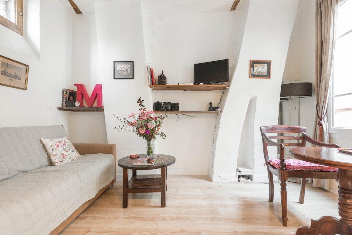 Studio appartment 21m2 located in the heart of Paris 4th floor (courtyard). Close to metro station (150 yards). 18th century building with original features, well maintained and quiet. Small balcony, wooden beams, parquet flooring, bright. All equipped: sofa bed (high quality), TV, internet. Kitchen: washing-machine, coffee-maker, toaster, kettle, cooking stove, micro wave oven, fridge with freezer, cutlery. Bathroom with large shower, hair dryer, iron and ironboard. Cupboard and bedlinen...