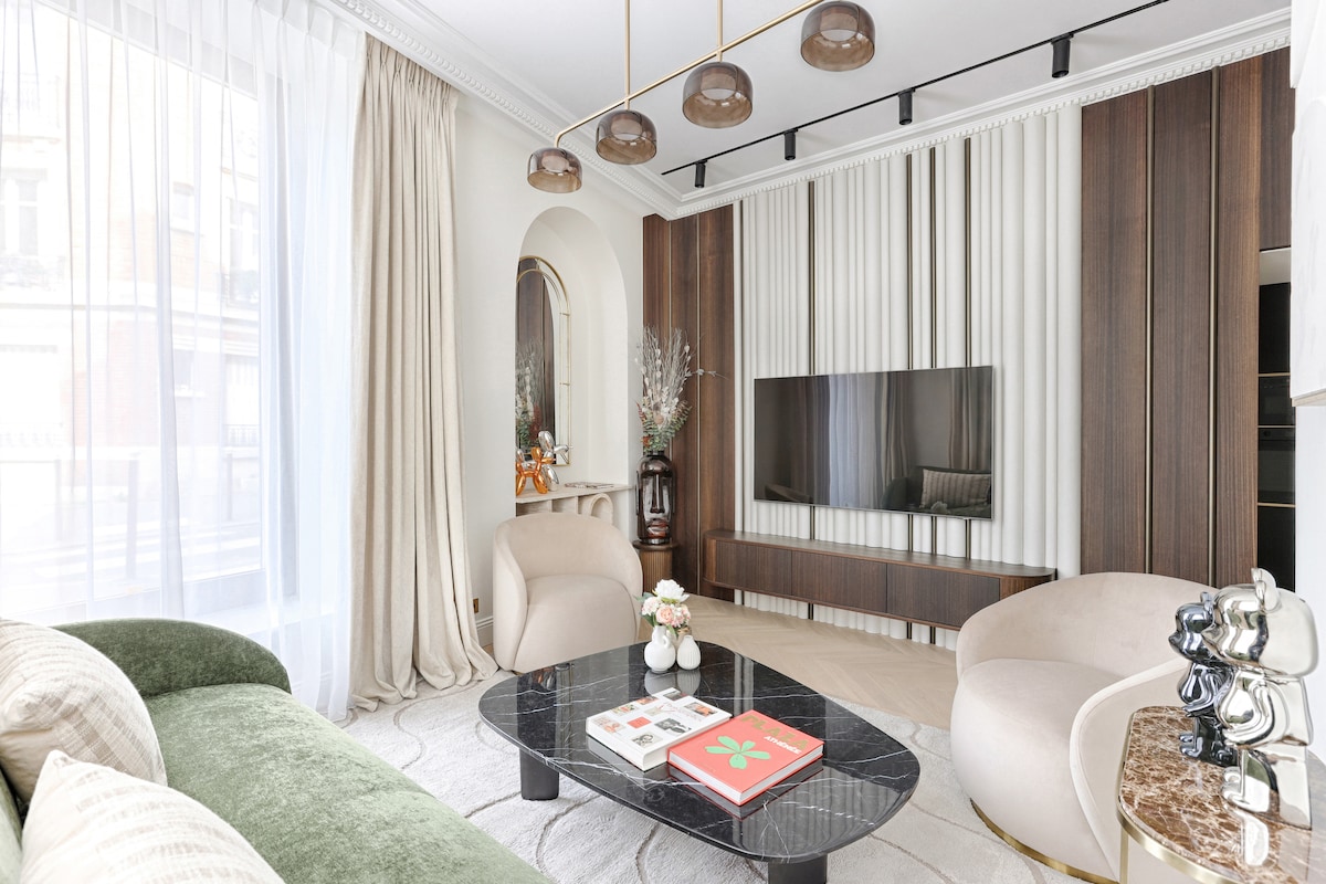 Discover this magnificent 90m² air-conditioned apartment, designed like a hotel suite and boasting a beautiful 25m² private terrace in the heart of Paris's 8th arrondissement. Completely renovated by an architect, it is located on the 5th floor (with elevator) of a traditional building with excellent security. It's the ideal place for a memorable stay in the capital.