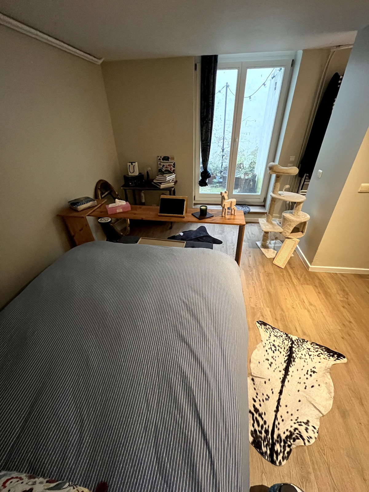 Cozy tiny house with large bedroom and private bathroom and toilet, overlooking the patio full of flowers and hammocks (in Summer). The place is part of a larger apartment situated in a typical Brussels house, ideally located at 2 steps from Saint Boniface and place Fernand Coq with its many restaurants and bars. The shopping street, with bus and metro stops, is just around the corner. The prestigious avenue Louise is a 5min walk and the historic city center is 15 min walk away.