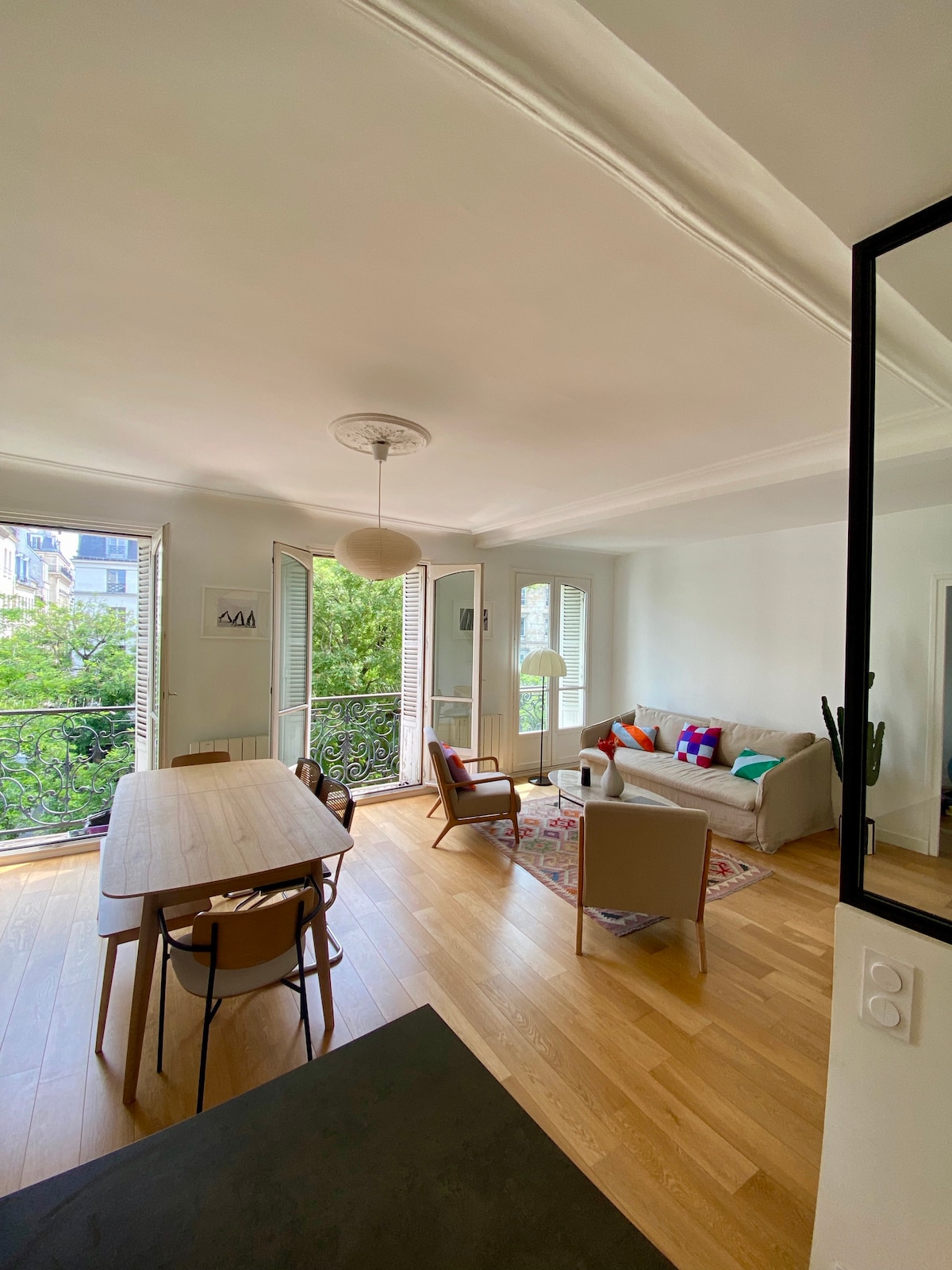 Elegant 66 m2 apartment in central Paris, newly redone to luxury perfection! This is a 2-bedroom flat, centrally located where the 9th & 10th arrondissements meet. - Beautiful, high ceilings with luxury finishings - Work station w/ standing desk, FAST fiber WIFi, monitor, keyboard, mouse - Fully stocked kitchen (incl. Nespresso, NutriBullet, oven, dishwasher, etc) - Samsung Frame TV (Netflix, Prime, YouTube, 200+ channels) - Luxe marble bathroom