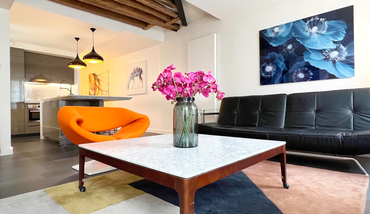 Your apartment, nicely decorated with a French touch & genuine material, is fully equipped for your optimal comfort. It is ideally located in the very center of Paris to discover the historic city and enjoy the French way of life. The lively environment includes dozens of nice little restaurants, trendy bars, organic bistrots, cafés, specialized grocery stores, fashion shops, pedestrian streets. Ideal for a couple or a small family (babies welcome), a well as for friends or business travelers.