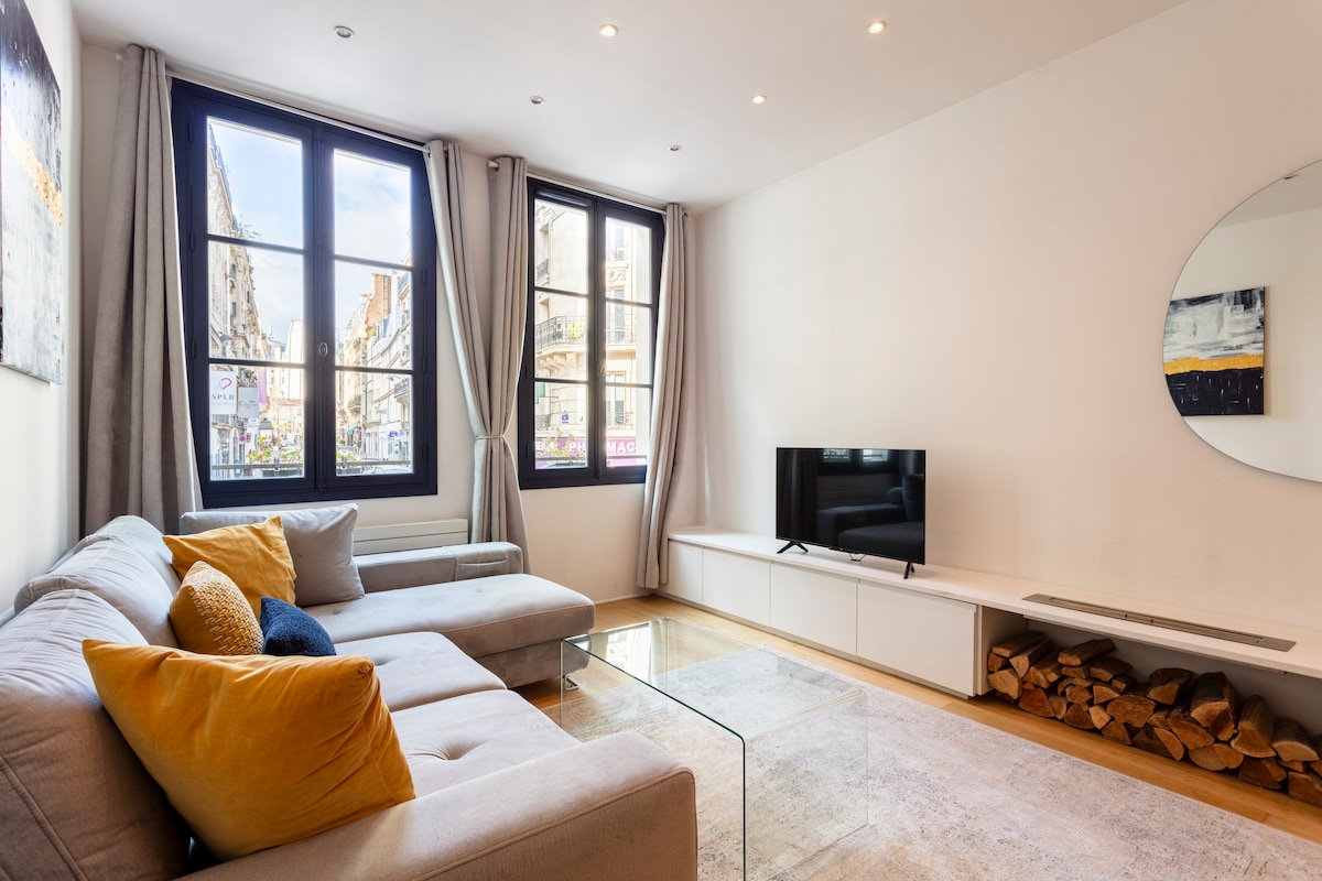 Beautiful flat at the limit of the 9th and 2nd districts by Boulevard Haussmann! This recently renovated studio features a gourmet kitchen, a spacious living space decorated with a combination of french classics and modern touches - Spacious storage and closet for clothes. High quality queen size bed- Smart TV, Wifi, dining area. Enjoy walking to restaurants, bars and fancy department stores! 6 metro lines minutes’ walk away! We offer luggage storage at arrival and departure!