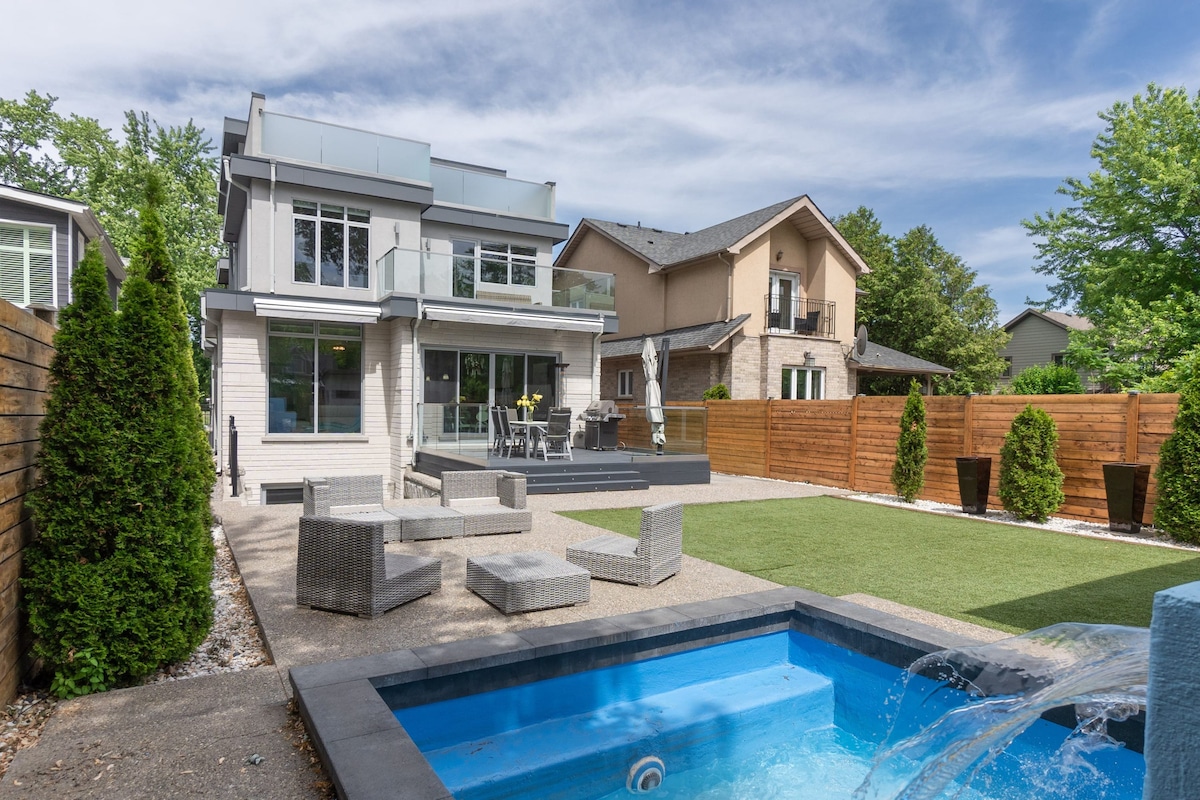 Enter through the grand foyer with a winding staircase, pass the kitchen, and step into the relaxing backyard featuring an in-ground, diamond-shaped, solar-heated swimming pool and a stunning lake. The view of the lake is beautiful! The area is quiet and scenic, with the soothing sounds of the lake lulling you to sleep. You are just 30 minutes away from Niagara Falls and 1 hour from Toronto. On a clear day, you can even see the Toronto skyline. It's the perfect place for a group or family of 9.