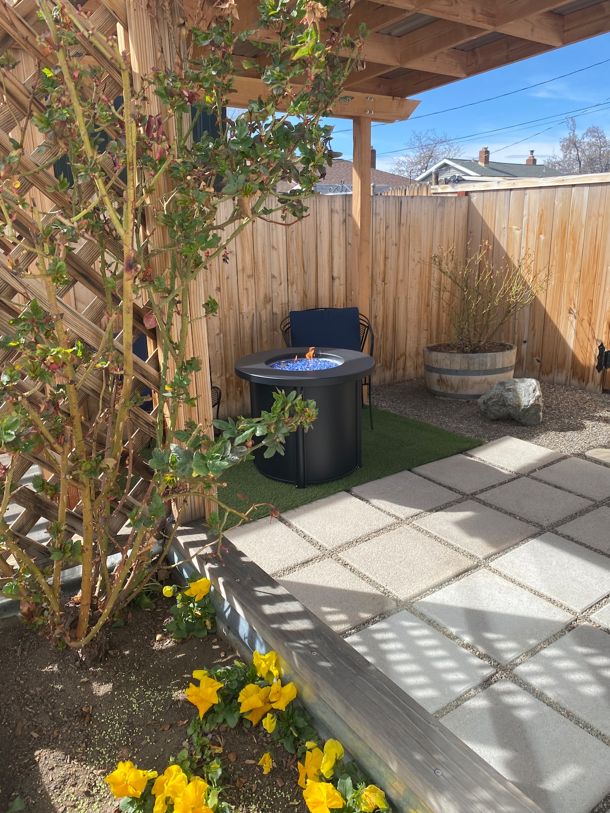 A charming 1940 brick duplex, updated for modern living in Reno's Wells Avenue district with yard, mountain views, cute garden, and off-street parking. The quaint 1bd features a queen bed, WiFi, work space, and an 80in projector with HD display and Bose speaker for a movie-like experience. We updated the entire interior - new plumbing, electrical, kitchen and bath. The result is a crisp white modern one-bedroom that provides everything you need for a relaxing holiday in the heart of Reno.