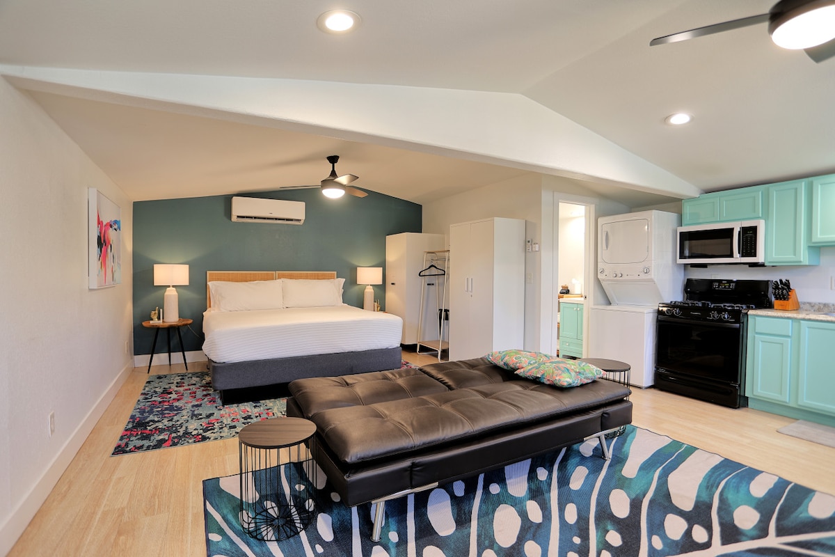 Welcome to Evie’s Studio! This delightful studio space is perfect for one or two travelers. Enjoy tiny living with all your essential comforts; our small but mighty studio features a queen size bed, private bathroom, 42" Smart TV, a small dinette, with vintage fridge, microwave and a Keurig for your morning cup of Joe!
