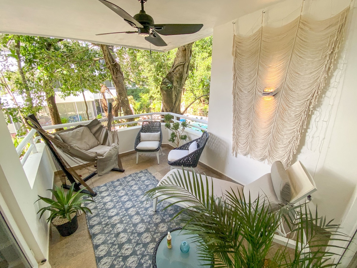 *Calming views of the jungle with wildlife, minutes from amazing snorkeling beach in Akumal. Two bedroom condo sleeps 6 with a walk out swimming pool on 1st floor. An outdoor grill/common area for guests. Extended stay guests welcome with high speed Internet for working remotely. *Safe complex in the gated resort of Grand Sirenis. Local restaurants within a short distance. *Open concept living/dining and fully equipped kitchen specially designed for your stay with all the comforts of home.