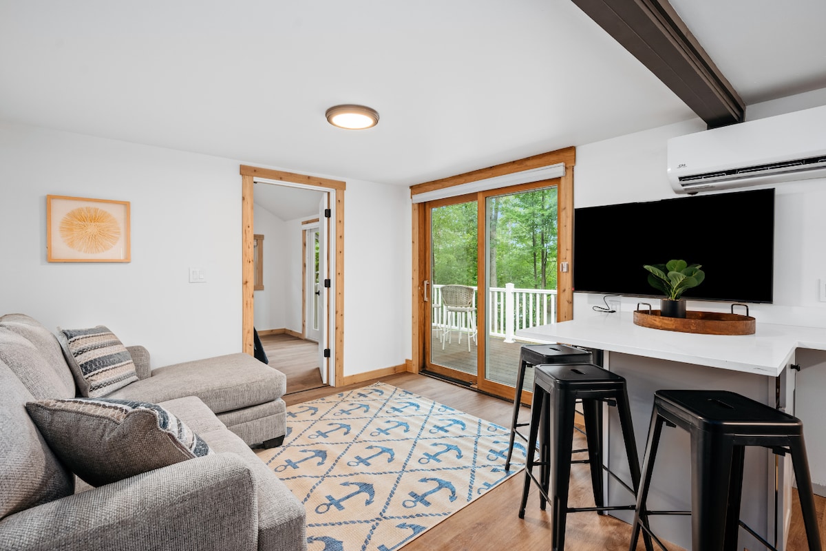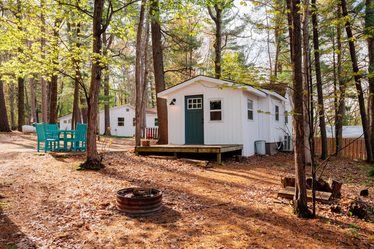 Welcome to our private Tiny Villa! It is completely stocked with dishes, cookware, gas grill, beach chairs, towels, wifi, fire pit etc… Tucked away overlooking the pond, it’s a perfect place to relax after a day of activity. An easy 20 minutes to Traverse City where you can go to the beach, shop or enjoy many excellent restaurants. Firewood available on site & have the following to RENT: Pontoon, kayaks, & paddle boards ( Contact H2O Sports Rentals to book these items or message us)