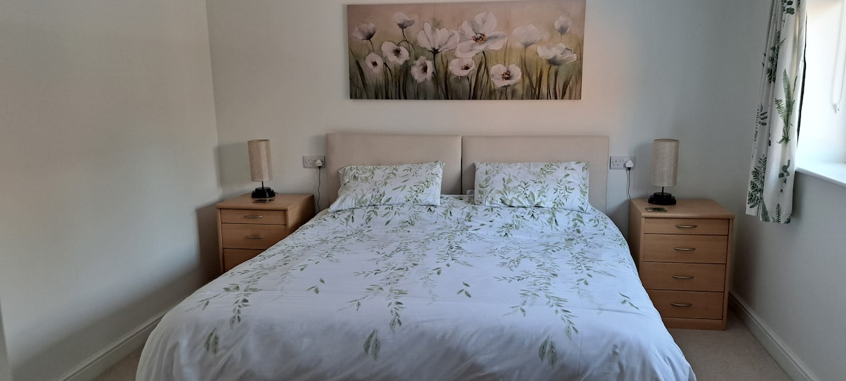 A lovely self-contained studio with patio area and free parking. It contains a king bed, chair & work desk; kitchen with fridge, sink, hob and microwave and all necessary crockery and utensils etc; wardrobe, drawers; bathroom with good size shower; wifi TV and USB sockets; its own central heating and hot water systems and modern decor. Towels, tea-towels, soap, washing up liquid and bed linen provided along with some basic food items such as salt/pepper, teabags, coffee, sugar, squash, etc