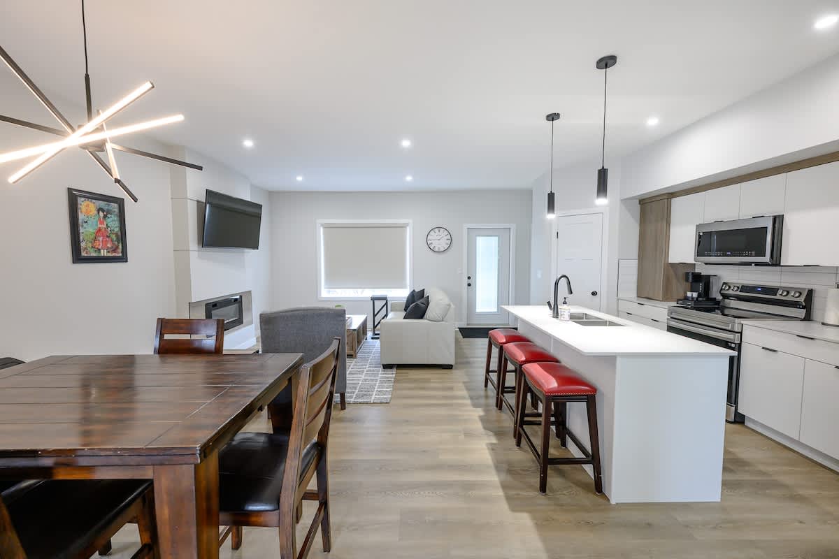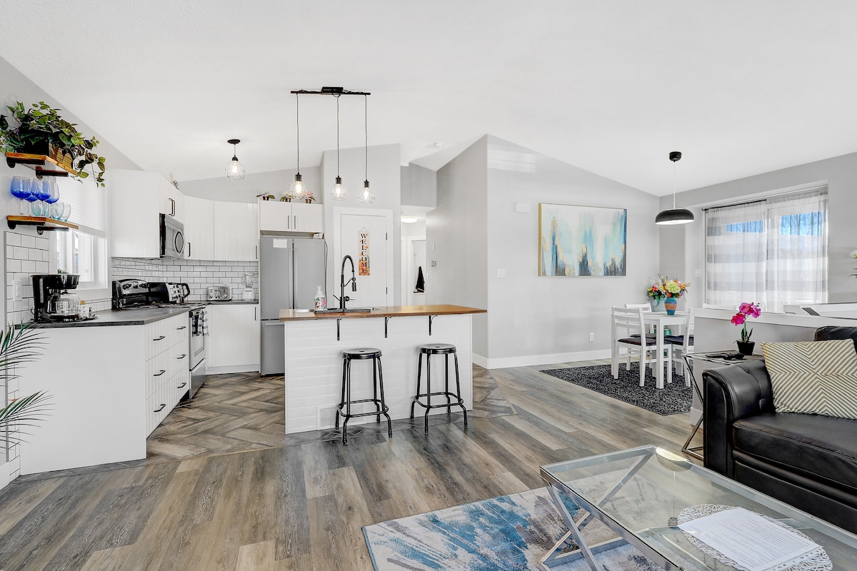 Kick back and relax in this calm, stylish space located in close to all amenities. This open concept floor plan is flooded with natural light and includes, private parking for 2 vehicles, 2 bedrooms, 2 full bathrooms, dining area for 4 and a fully stocked kitchen complete with air fryer and Nespresso machine. We hope to provide you with a comfortable home away from home. Enjoy the ease of keyless entry and a quick check in. We hope to host you soon !!