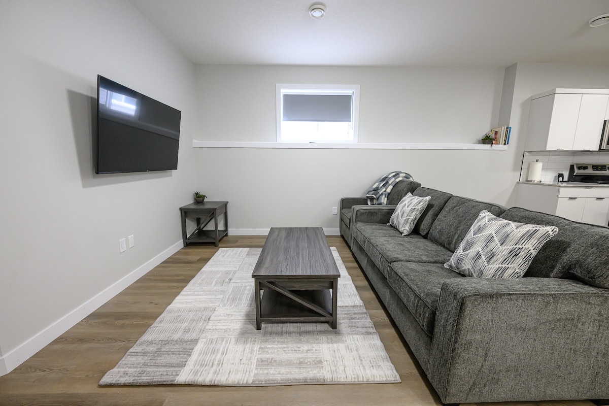 Welcome to The Riverstone Retreat. A brand new 1 bedroom lower level guest suite with keyless entry. Kick back and relax in this calm, peaceful house and neighborhood. The Home is close to highway 40, Eastlink Center & within minutes to Shoppers drugmart, Superstore, Costco, Bestbuy, Winners and the airport. One bedroom with a double adjustable bed, 1 bath and full living room space with with Roku TV, reclining couch and wet bar. This space is smoke and pet free.