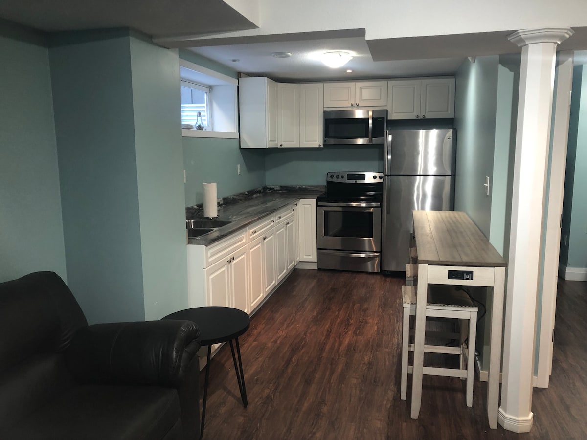 We would like to welcome you in our home: - No shared spaces - Private entrance w/keyless entry - 2 bed 1 bath basement suite w/kitchenette (microwave, sink, coffee-maker, kettle, toaster, cutlery, can opener, cutting board, air fryer) - Living room w/large 55' TV - High speed unlimited internet, workspace, FireTV (Netflix, Youtube) - Private deck/patio/outdoor area - Conveniently located and quiet - We will not bug our guest, but are available for any questions. Please let us know!