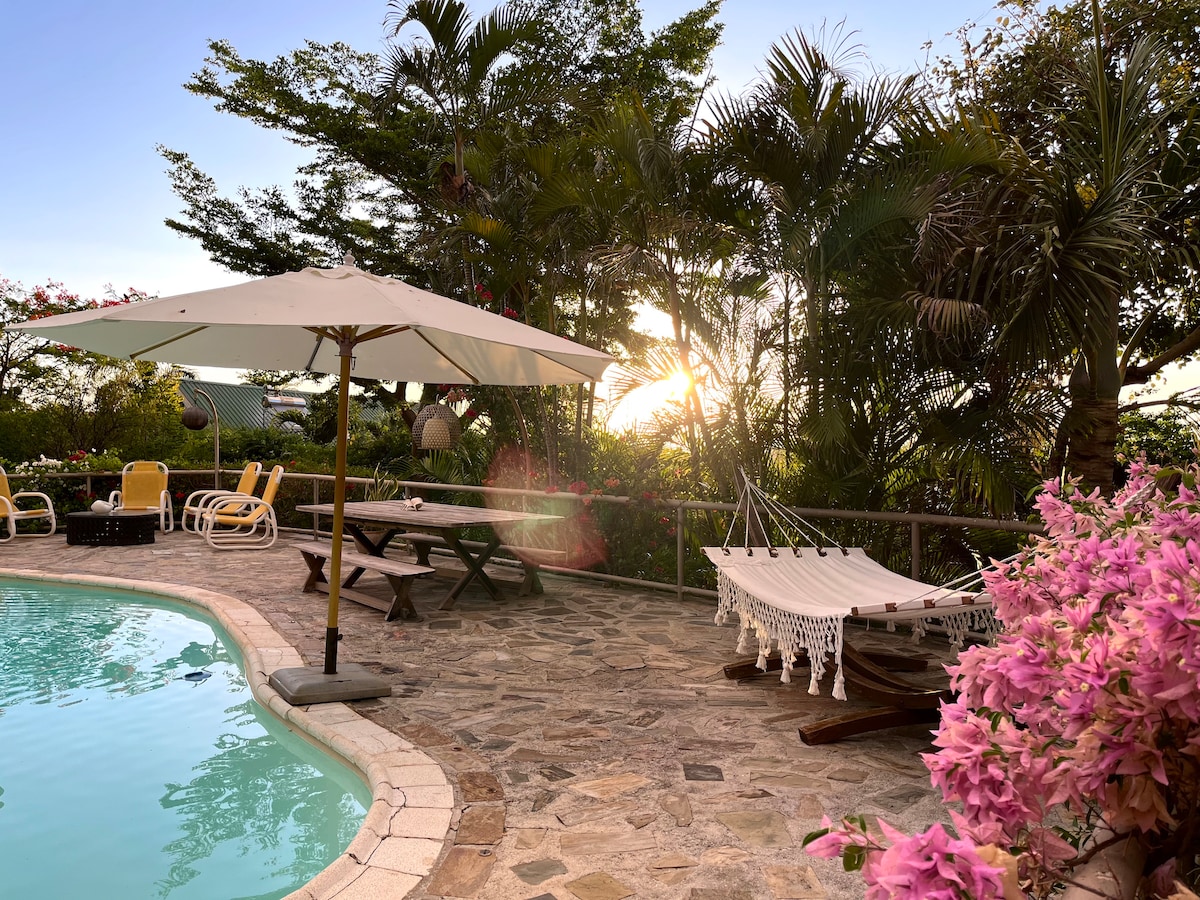 Dans un jardin tropical ombragé par un grand manguier, une piscine privée (uniquement pour vous) vous invite à vous détendre en toute tranquillité. La terrasse, nichée au bord du manguier, offre une vue apaisante sur le jardin et la piscine, idéale pour savourer des moments de calme. Ce logement entier est un premier étage de villa avec une entrée exclusive, un parking privé et un portail automatique. Vous profiterez de votre séjour en toute intimité.