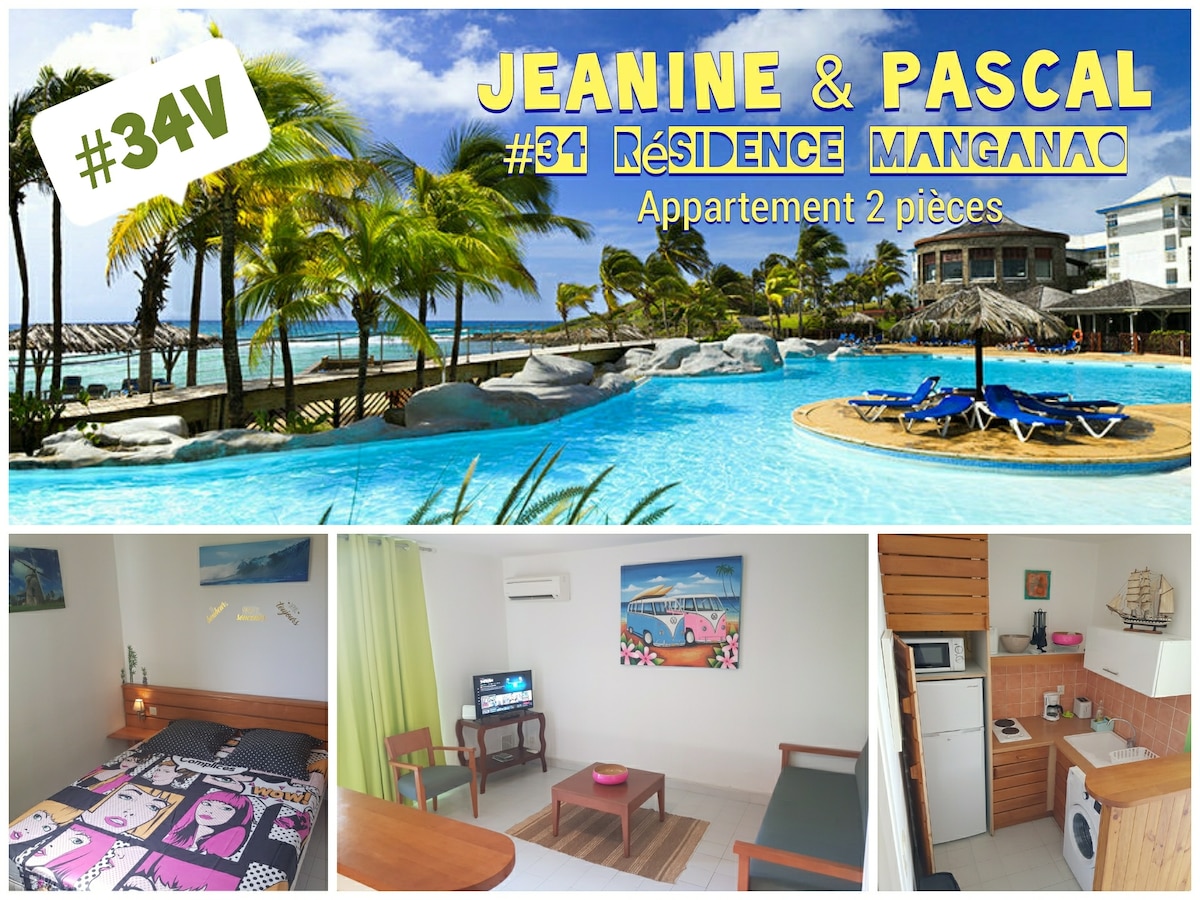 Studio de 30m2, confortable, cosy, ouvert sur l'extérieur, invite au repos dans un environnement de rêve. Il vient juste d'être rénové, au 2 ieme étage du bâtiment Frangipanier au 548, côté ombré. Résidence surveillée par des agents sécurité, plage lagon à 50 mètres, piscine à débordement à 50 mètres. Climatisation neuve et individuelle. lit 180*200. Linge de lit et de toilette fournis Serviettes de plage