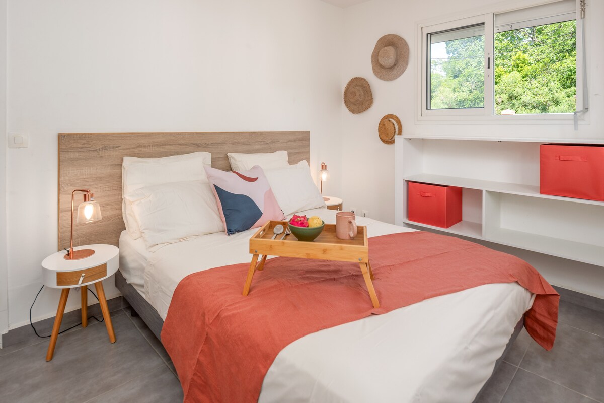 In a quiet subdivision, 50m from all amenities (supermarket, bakery, pharmacy, laundromat, restaurants, bus stop) an air-conditioned double bedroom (possibility of extra bed for a child) with shower room, toilet, fully equipped kitchen, connected télévision (netflix, prime video, etc.), wifi, terrace overlooking a large garden with trees and swiming pool, outdoor lounge, deckchair, barbecue. Everything can be done without renting a car. A water tank is connected so no water cuts.
