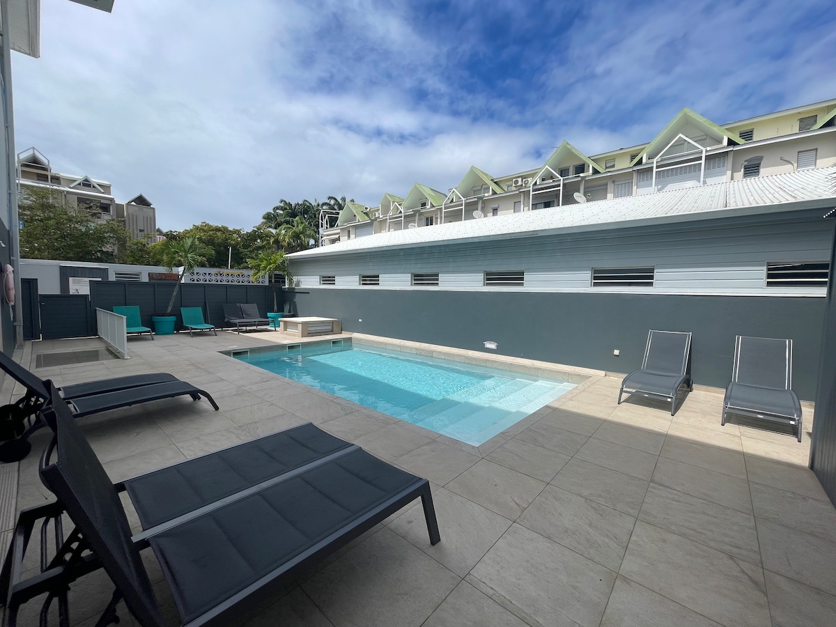 Laissez-vous séduire par cet adorable studio décoré avec soin ambiance cocooning. Situé à Saint-François, à seulement 500 mètres de la plage des Raisins Clairs, cette hébergement est en bord de mer, plage privée et une piscine extérieure payante, un jardin, un restaurant une laverie et différents commerces au sein de la résidence. Il propose un parking privé gratuit.