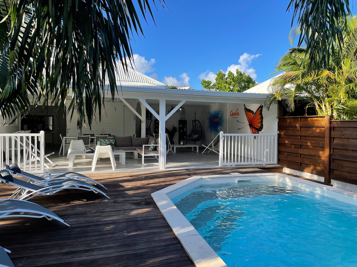 This peaceful Villa offers a relaxing break for the whole family. Located 10 minutes from the beaches and 5 minutes from the market and fishing port of St. François, Villa Pahloé welcomes you to Saint François. The villa offers 3 bedrooms, each with its own bathroom and comfortable bedding. You'll appreciate the 6x4m swimming pool, the wooded garden and the shaded terraces for your meals and moments of idleness. Tastefully decorated, you'll have an excellent stay. See you soon in Guadeloupe