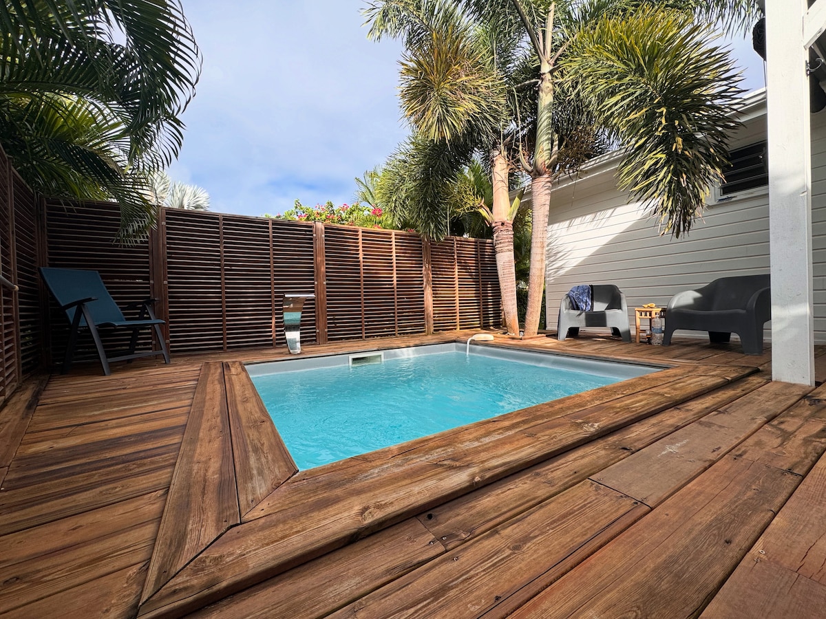 À 250 m à pied de la plage, dans une ambiance tropicale ce logement invite à passer du bon temps entre les visites de l'île et les sorties plage et surf. Il est équipé de : - 2 chambres avec lit en 140, climatisées et équipées de brasseurs d'air, - cuisine équipée, - lave-linge, - salle d'eau, - piscine privative, - citerne d'eau pour éviter les coupures intempestives, - parking fermé.