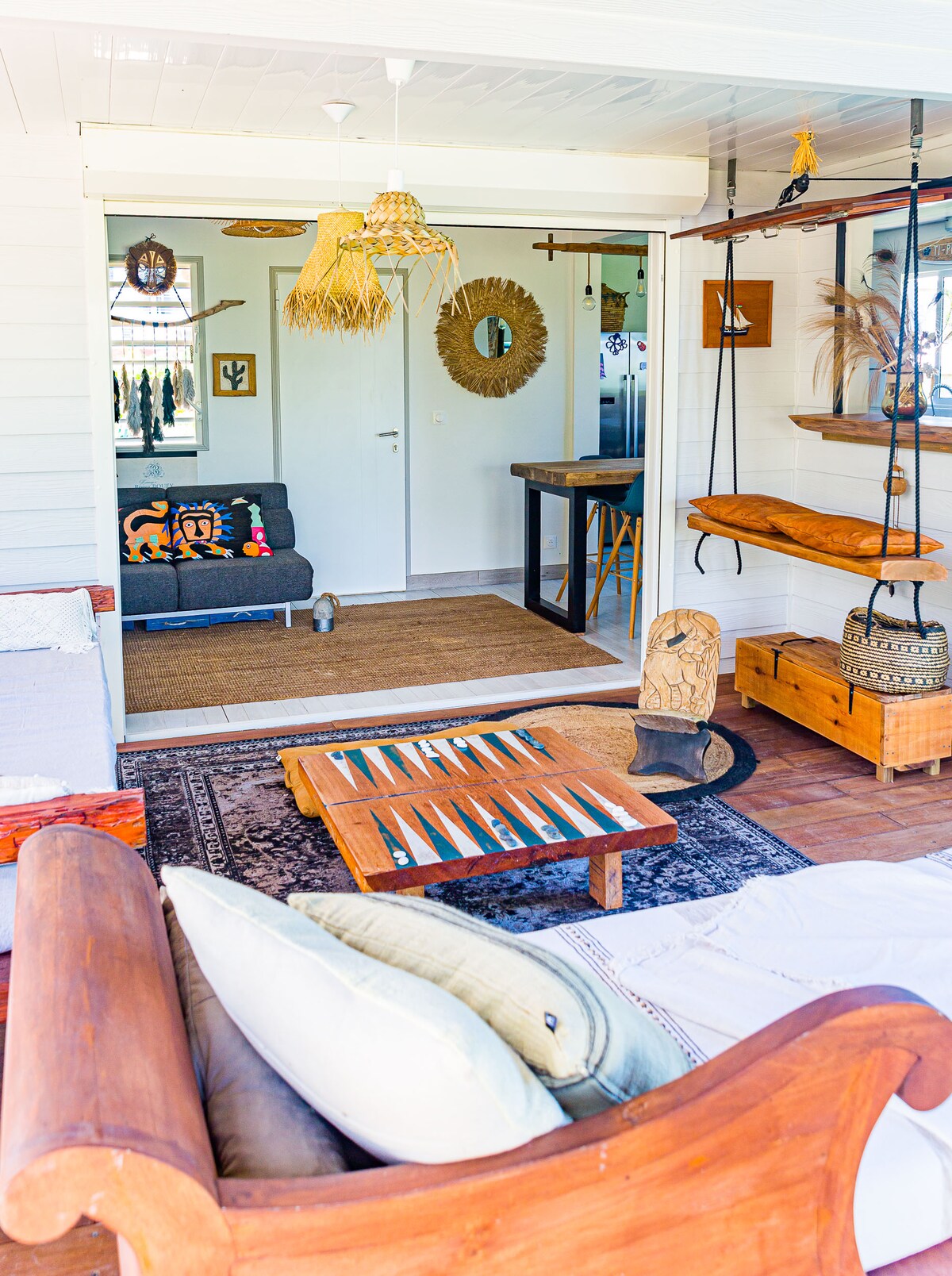Venez vous détendre dans mes villas. Construites en containers maritimes, je me suis investie pour y mettre mon âme de voyageuse en m'inspirant de tout ce que j'ai pu découvrir en parcourant le monde. J'ai imaginé la piscine comme une rivière coulant au milieu d'une végétation luxuriante. Un tipi permet de se prélasser au soleil. Le confort de la chambre climatisée avec vue directe sur la mer au delà de la cime des arbres. Bref, je vous invite dans mon esprit, durant mon absence.