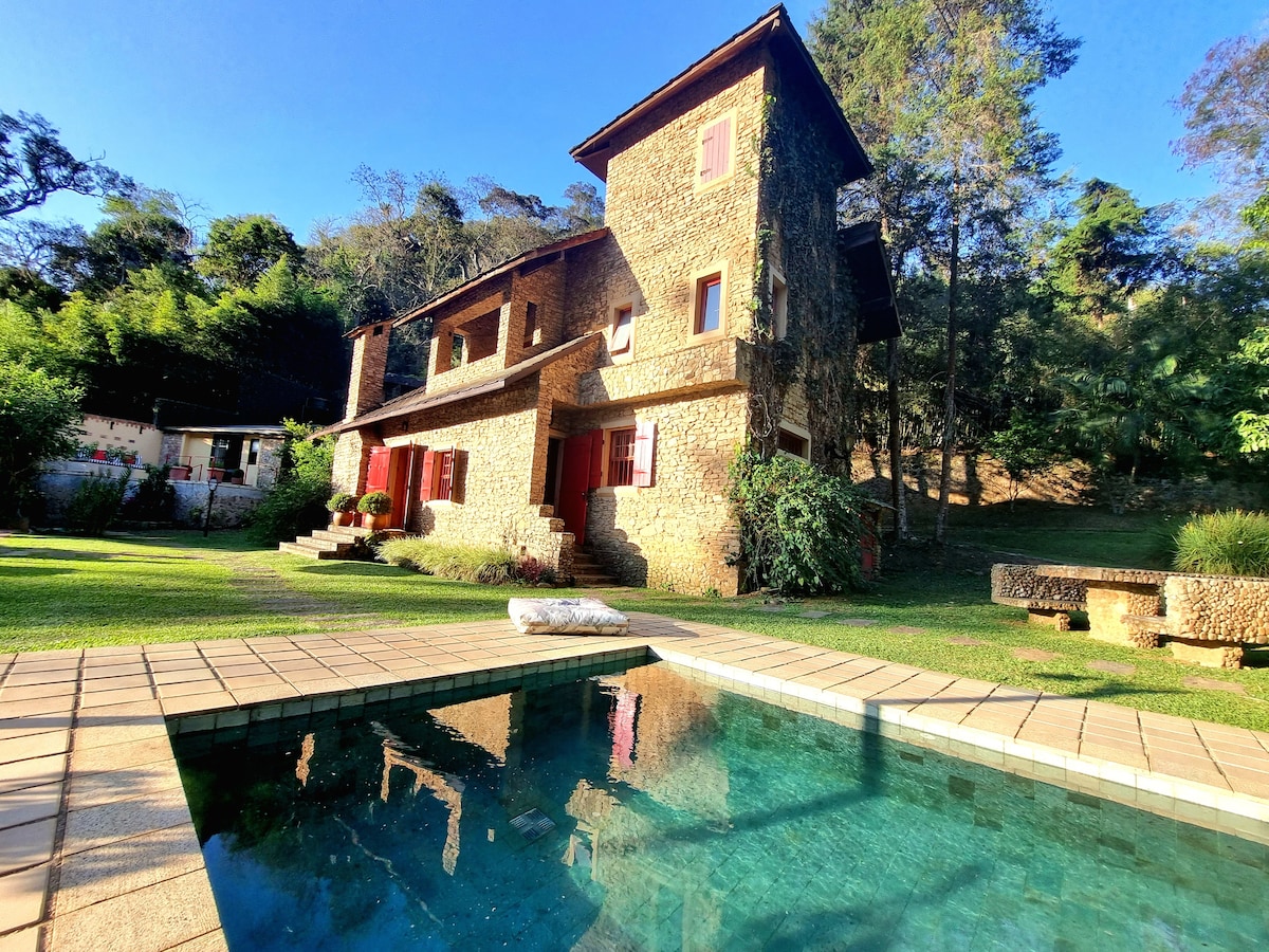 Linda casa em estilo Provençal com deck e piscina privativos debruçados para o riacho. Duas lindas suites com camas queen e casal , varanda, ar split e vista para o lago . Mezanino ao lado da suite principal com bicama de solteiro. cozinha completa , sala ampla, churrasqueira portátil! Ideal para famílias ou momentos românticos na Serra de Petrópolis. Seu pet é muito bem vindo! Não permitimos eventos no local!