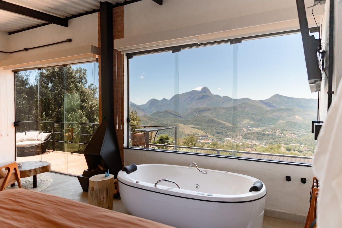 Somos o Espaço Verde Novo e este é o Chalé Ion! Banheiro amplo com vista para a mata, deck externo, jacuzzi, chuveiro aberto, cozinha equipada, cama king e lareira. Chalé totalmente privativo. Varanda com rede para curtir a vista da cachoeira e mata. Um charme perfeito para uma estadia agradável na serra de Teresópolis. Próximo a Praça do Alto. Somos o Espaço Verde Novo, siga nosso insta e sinta a paz do verde!